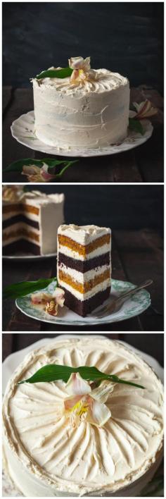 Chocolate and pumpkin layers filled with maple cinnamon mascarpone-this cake will be the most beautiful finish to your holiday feast!