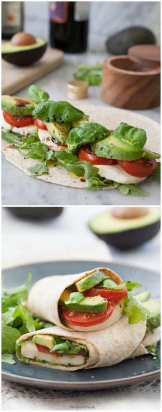 Avocado Caprese Wrap with Arugula and Balsamic #recipe on http://foodiecrush.com Check out more recipes like this! Visit yumpinrecipes.com/