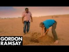 Gordon Ramsay digs a pit for an oven in the desert for Bozzo's desert dinner party. From Gordon's Great Escape.