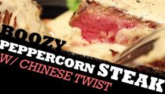 Mouthwatering Video Recipe of a Steak Au Poivre (peppercorn steak) twisted with asian flavors, and a good drizzle of insanely hard unknown booze...