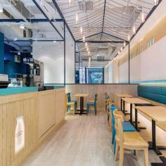 Over-decoration got the elbow, and instead the pair went down the minimalist route, weaving in dairy farm motifs such as milk bottles patterned on the walls and hanging overhead as light fittings. The bottles seem to drip condensation onto the surface below, and the organic feel of the venue is palpable...