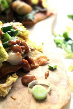 Delicious fusion tostadas with beer battered avocado, drunken mushrooms, slaw and peanut sauce. We had such a great time making these.