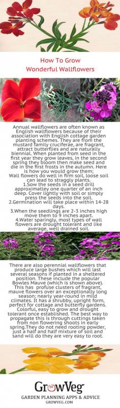 An English Cottage garden favourite the wallflower is easy to grow and will flourish with very little attention. The short lived types are biennials, but there are some perennial types too of which Bowles Mauve is one. Fragrant, drought tolerant and beloved of butterflies they add a splash of colour to a border and will flower profusely until the frosts. For similar plants check out our pinterest board English Cottage Gardening.https:/...