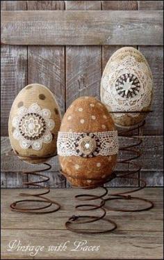 Easter Decoration - Decoupaged and Embellished Paper Mache Eggs on Rusty Bed Springs