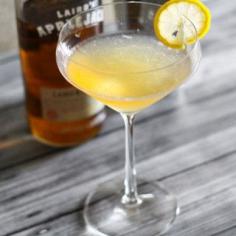 Harvest Moon Cocktail from Platings & Pairings. Applejack, orgeat (almond syrup), lemon juice. Garnish with lemon slice.