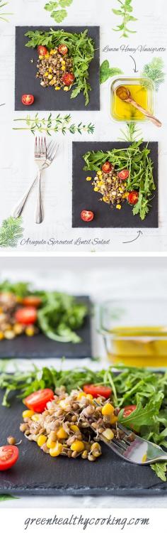 A recipe for a deli Arugula Sprouted Lentil Salad with Lemon Honey Vinaigrette. Sprouted lentils are much faster to cook and a whole lot easier to digest.