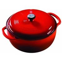 6 quart Dutch oven with lid. Porcelain enamel cast iron in graduated blue finish. 10.75 inch diameter. Convenient handles on base. Knob on lid - oven safe to 500 degrees. Hand wash with soapy water and plastic or nylon scouring pad. Dishwasher safe. Use only wooden or silicone utensils. Suitable for use on all cooking surfaces - even induction. Limited lifetime warranty. Turn your next batch of soup into a work of art by brewing and serving it in a Lodge Color Enamel 6 Qt. Dutch Oven in Caribbean. This large round enamel cast iron oven combines the utility of cast iron with the beauty of a graduated blue finish for a pot that is sure to become a cherished family heirloom. This classic has handy touches like the large, easy to grab knob - it's oven safe to 500 degrees - on the lid and the two handles on the base that make this a cook's best friend. Cast iron has excellent heat retention and diffusion properties, meaning cast iron vessels maintain heat and cook food thoroughly and evenly, no matter the cooking surface. It even works with induction heating. An enamel coating eliminates the need to season the metal and allows for more thorough cleaning, and makes the gorgeous graduated blue finish possible. dishwasher safe. About Lodge Manufacturing Founded by Joseph Lodge in 1896, Lodge Manufacturing is the oldest family-owned cookware foundry in America and is a market leader in cast iron cookware. Nestled alongside the Cumberland Plateau of the Appalachian Mountains is the town of South Pittsburg, Tennessee, where Lodge produces the finest cast iron cookware in the world. The company offers the most extensive selection of quality cast iron goods on the market, including skillets, Dutch ovens, camping cookware and more. Lodge is also an eco-responsible company, with programs to reduce hazardous waste, reuse foundry sand, establish new ponds for plant and animal life, and plant new trees on the Lodge campus. Color: Red.