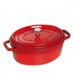 Dutch Ovens - The 7-Qt. Staub Wide Oval Cocotte features elegant enameled cast-iron and a self-basting system for restaurant-quality, gourmet entrees and one-pot dishes. Handcrafted in France, the Staub cast-iron cocotte prepares roast beef, pork, poultry, vegetables and more to succulent, flavorful perfection. With its superb heat distribution and retention, the Staub Dutch oven hides its secret under the lid. Rounded spikes collect and release condensation to shower juices continuously over food. The circulation of heat with juices allows ingredient flavors to maintain full intensity, while preserving nutrients. A Staub signature black matte enamel interior is superior for high-heat searing, plus braising and caramelizing. The more you cook with the oval cocotte, the better it performs, seasoning naturally with use, without maintenance. Cast in a single-use mold, the cast-iron cocotte is high-fired at 1,400 F, with 2-3 separate coats of enamel inside and out and is PTFE- and PFOA-free. Resistant to - Specifications Made in France Material: enameled cast-iron, stainless-steel/nickel Model: 1103385 (basil), 1103325 (black), 1103306 (cherry), 1103391 (dark blue), 1103318 (graphite), 1103387 (grenadine) Capacity: 7 qt. / 6.7 L Size: 13"L (15 3/4" with handles) x 10 1/4"W x 5"H (7 1/4" with lid) Base: 11 1/4"L x 8 1/2"W Weight: 15 lb. 8 oz. Use and Care Before first use, wash with warm water and dishwashing liquid, then dry. Apply a small amount of cooking oil in your pot before using to enhance the properties of the special black enamel. Dishwasher-safe, but hand washing recommended. Oven-safe to 500 F and broiler-safe. Suitable for gas, electric, glass, halogen and induction stove tops.
