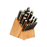 The Classic 21-Piece Deluxe Block Set from Shun contains everything you need in quality kitchen cutlery. ; 21-piece set includes: 6 x Steak Knives - glide through your steak with no serrations that can tear the meat. 1 x 2.5 Bird's Beak paring knife - the classic tool for making decorative cuts, delicate peeling and detail work. 1 x 3.5 Paring Knife - ideal for paring fruits and vegetables. 1 x 3.5 Vegetable Knife - for mincing small herbs and vegetables on a carving board, or other small precision tasks. 1 x 6 Serrated Utility Knife - great for onions, cheese or tomatoes. 1 x 6 Chef's Knife - great for a majority of cutting, slicing and dicing tasks. 1 x 8 Chef's Knife - perfect for slicing, dicing, and chopping small to medium-sized fruits, vegetables, and other foods. 1 x 7 Hollow-Ground Santoku Knife - designed for cutting vegetables, thin-boned meats, and fish; the hollow-ground edge keeps food from sticking to the blade as it slices. 1 x 9 Hollow-Ground Slicing Knife - nothing beats this essential knife when you want paper-thin slices. 1 x 7 Vegetable Cleaver - classic cleaver design makes short work of tough vegetables and chunks of meat. 1 x 6 Boning/Fillet Knife - expertly prep meat prior to cooking. 1 x 8 Offset Bread Knife - excellent for slicing bread or sandwiches. 1 x Carving Fork - holds food in place while slicing or carving. 1 x Kitchen Shears - a trusty essential for snipping herbs, or cutting twine or flower stems. 1 x Honing Steel - keeps everything sharp. 1 x 22-Slot Bamboo Knife Block. ; Exotic Japanese steel allows the knives to hold their razor sharp edges longer without excessive re-sharpening. ; High density VG-10 super steel cutting core is clad with 32 layers of SUS410/SUS431 high-carbon steel, creating a beautiful Damascus clad knife. ; Comfortable D shape Pakkawood composite handles provide a sanitary, sure grip. ; Hand wash with gentle dish soap that contains no bleach or citrus extracts, towel dry. ; Handcrafted in Seki City, Japan.