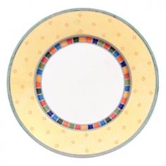 Villeroy & Boch A brightly coloured, conventionally shaped salad plate. 21cm diameter. Main colours are: white main body, and a yellow rim with a thin mosaic detail in red; blue, green, orange and yellow square motifs. Ideal for salads, small lunches or starters, hot or cold. A perfect accompaniment to any product from the 3 mix & match designs of the Twist Alea ranges - Limone; Verde and Caro. Made of Premium porcelain for strength and durability. Microwave and dishwasher safe. Porcelain, Dishwasher safe, Microwave safe, Not oven safe.