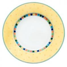 Villeroy & Boch A brightly coloured, conventionally shaped dinner plate. 27cm diameter. Main colours are: white main body, and a yellow rim with a thin mosaic detail in red; blue, green, orange and yellow square motifs. Ideal for main courses, large lunches or cooked breakfasts, hot or cold. A perfect accompaniment to any product from the 3 mix & match designs of the Twist Alea ranges - Limone; Verde and Caro. Made of Premium porcelain for strength and durability. Microwave and dishwasher safe. Porcelain, Dishwasher safe, Microwave safe, Not oven safe.