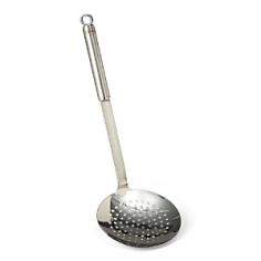 Flat design with large perforations for skimming, straining and lifting out food. The extra wide and flat base of the skimmer retrieves even small bits of food from the base of the pan and deals with delicate food very carefully. Substantial in the hand and comfortable to use, this German designed skimmer will give a lifetime of reliable service. Color: Silver.
