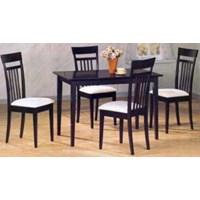 Includes table and four side chairs. Casual style. Rectangular shaped table. Smooth table top. Chair with subtle curves. Attractive slat back design. Upholstered seating. Clean lines and sleek tapered legs. Rich cappuccino finish. Table: 48 in. L x 30 in. W. Chair: 20.5 in. W x 17 in. D x 39.5 in. H. Warranty Chic yet simple, this 5-Pc dining set will enhance your breakfast nook or dining room. Create an inviting and stylish dining atmosphere with the sophisticated charm of this dining table and chairs group.