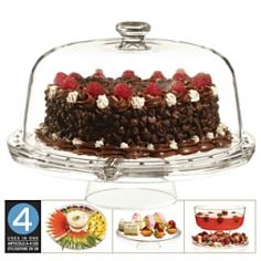 More than just a cake stand with cover, this glass serving piece will come in handy every time you have a party. Turn it over and reconfigure it and it becomes a chip and dip set, a round tray for serving breakfast pastries or cocktail hour hors d'oeuvres, or a punch bowl for birthday parties. The 4-in-1 cake stand comes with a heavy, domed lid and a stand that can be turned into a bowl for dips or sauces. Dimensions: Base to plate: 3.25-in. , Plate to top of dome: 5.75-in. , The diameter of the plate is 12.25-in.