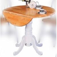 This pretty dining table will add a touch of charm to your casual dining room Perfect for a breakfast nook, this table has a smooth round top with a drop leaf for convenient everyday use The elegant empire pedestal base has enough character to warm up your room, in a lovely two tone Natural and White finish Pair with chairs from this collection for a unique style in your casual dining space. Features: Two tone Natural and White wood finish Solid wood construction Casual style Smooth rounded edges, turned legs and bases Smooth Rounded Edge Single Pedestal Round shape Drop LeafSpecifications: Overall dimensions: 30H x 40W x 40D inches Weight: 45.19 lbs.