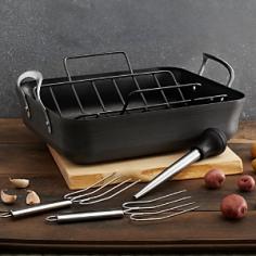 16-inch nonstick roaster set. Heavy-gauge, hard-anodized aluminum. Cast stainless steel loop handles. Dishwasher safe for easy cleanup. Oven safe to 450 degrees Fahrenheit. Manufacturer's full lifetime warranty. Make the most of your roast with the Calphalon Contemporary Nonstick 16 in. Roaster Set. Perfectly sized for large turkeys, hams, and roasts, this set comes complete with a 16-inch roaster, nonstick rack, injection baster, and two stainless steel lifters. The quadruple-riveted handles make lifting and turning easy, and the roaster goes from stovetop to oven (up to 450 degrees Fahrenheit). Plus, both rack and pan feature PFOA-free, triple-layer nonstick that's so tough it's dishwasher safe. Cast stainless steel loop handles and heavy-gauage, hard-anodized aluminum for even heating complete the roaster's design. Includes Calphalon's lifetime manufacturer's warranty. About CalphalonCalphalon's mission is to be the culinary authority in kitchenwares, enhancing the home chef's food experience during planning, prep, cooking, baking, and serving. Based in Toledo, Ohio, Calphalon is a leading manufacturer of professional quality cookware, cutlery, bakeware, and kitchen accessories for the home chef. Calphalon is a Newell-Rubbermaid company. Calphalon's goal is to give you, the home chef, all the tools you need to realize your highest potential in the kitchen. From your holiday roasting pan to your everyday fry pan, count on Calphalon to be your culinary partner - day in and day out, for breakfast, lunch, and dinner for a lifetime.