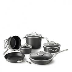 11-piece cookware set with multi-layer nonstick. Heavy-gauge, hard-anodized aluminum. Cast stainless steel loop handles. Dishwasher safe for easy cleanup. Oven safe to 450 degrees Fahrenheit. Manufacturer's full lifetime warranty. Everything you need, from the essentials to the specialty pieces, is all right here in the Calphalon Contemporary Nonstick 11-Piece Cookware Set. Triple-layer PFOA-free nonstick material is built to last (and even dishwasher safe), while the heavy-gauge hard-anodized aluminum promotes even heating. Stainless steel loop handles complete the design, and these pieces are oven safe up to 450 degrees Fahrenheit. You'll get a 10-inch fry pan, a 12-inch fry pan with lid, a 1.5-quart sauce pan with lid, a 2.5-quart sauce pan with lid, a three-quart saute pan with cover, and an eight-quart stock pot with lid. Manufacturer's full lifetime warranty. About CalphalonCalphalon's mission is to be the culinary authority in kitchenwares, enhancing the home chef's food experience during planning, prep, cooking, baking, and serving. Based in Toledo, Ohio, Calphalon is a leading manufacturer of professional quality cookware, cutlery, bakeware, and kitchen accessories for the home chef. Calphalon is a Newell-Rubbermaid company. Calphalon's goal is to give you, the home chef, all the tools you need to realize your highest potential in the kitchen. From your holiday roasting pan to your everyday fry pan, count on Calphalon to be your culinary partner - day in and day out, for breakfast, lunch, and dinner for a lifetime.