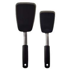 Utensils & Sets - Lifting and flipping all types of foods is convenient and mess-free with the OXO Flexible Silicone Turner. With its blend of strong stainless-steel and flexible high-heat resistant silicone, the flexible turner offers thin, bendable edges that glide easily under foods, keeping foods in one piece. The large flexible silicone turner is ideal for flipping eggs, burgers and chicken fillets. The smaller OXO turner is designed for smaller foods like mushrooms, chicken nuggets and tater tots. Flat silicone head cuts soft foods right in the pan without scratching the cooking surface. The silicone outer layer is heat resistant to 600 F and safe for nonstick cookware and bakeware. The silicone is bonded to a flexible stainless-steel core for added stability. The silicone utensil offers a comfortable, nonslip cushioned handle grip. Dishwasher-safe. OXO is the leading kitchen tool supplier to the world's gourmet kitchens. Originally engineered to assist the inventor's wife with her arthritic hands, - Specifications Material: stainless-steel, Santoprene, silicone Made in China Model: 1071536 Small Size: 4 3/4"L (11 1/2" with handle) x 3"W Weight: 4 oz. Large Size: 6"L (12 1/2" w/handle) x 4"W Weight: 5 oz. Use and Care Dishwasher-safe Silicone head is heat resistant to 600 F and safe for nonstick cookware and bakeware.