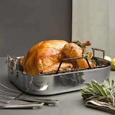 Roasting & Lasagna Pans - Heavy-duty pan has high sides to catch splatters and French-style, riveted, rapid-cool handles for easy, comfortable lifting - even with oven mitts. Whether it's garlic lamb, glazed ham or a stuffed turkey, this roasting set will produce perfectly browned, delicious meat. Versatile set includes roasting pan with rack and two stainless-steel turkey lifters, invaluable tools for moving large birds. Includes pan with rack and set of two stainless-steel turkey lifters. 16"L x 13"W x 3"D.Product Features: Heavy-gauge stainless-steel Easy to clean 18/10 stainless interior will not react with food All-Clad cast stainless handles with secure stainless rivets for easy and safe handling Not for use with induction ranges Lifetime warranty Dishwasher safe including turkey lifters Imported - Care and Use Before the first use, wash in hot soapy water with a sponge or dishcloth. Rinse in hot water and dry thoroughly. Clean interior with a fine powder cleanser with water to form a paste and rinse. DO NOT USE oven cleaners or cleansers with chlorine bleach. DO NOT USE steel wool. The exterior may be polished with one of the available commercial stainless-steel cleaners, rubbing in a circular motion. Rinse in lukewarm water. You may wash in the dishwasher.