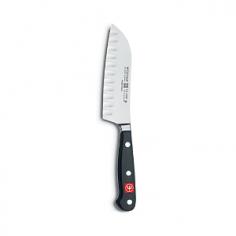 Santoku Knives - Similar to a butcher knife, the Japanese-style santoku knife is a multipurpose gem for slicing, cubing, or dicing. Available in 5" or 7", the distinctive hollow-ground edge that alternates scallops on both sides of the blade, and yields a smooth, clean cut. About Wusthof Classic: Precision-forged blades of Wusthof's own high-carbon, stain-resistant steel alloy, for a lasting edge that is easy to resharpen. Distinctive bolster prevents your hand from slipping onto the blade. Handle is a virtually indestructible composite, buffed by hand for a smooth finish and triple-riveted to the full tang for optimum strength and balance. Dishwasher safe, but hand-washing is recommended. Made in Solingen, Germany. - Specifications Made in Germany Material: high-carbon stainless-steel alloy, synthetic polymer 5" Santoku Knife Size: 5" blade (9 3/4"L w/handle) x 1 1/2"W Weight: 4 oz. 7" Santoku Knife Size: 7" blade (11 3/4"L w/handle) x 1 3/4"W Weight: 6 oz. Use and Care Your Wusthof Classic Santoku knife should be hand washed. Simply wipe the knife clean with a wet cloth and dishwashing detergent. Rinse thoroughly and dry immediately. Dry from the knife handle toward the blade. No metal is completely stain-free. To prevent slight tarnishing, be sure to remove acidic foods (lemon, mustard, ketchup, etc.) from the blade after use. If blade should show some signs of staining, clean with a non-abrasive metal polish. To prevent irreparable blade damage, it is best to store your Wusthof collection in a knife block or in-drawer knife tray.