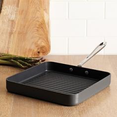 This 11" square Grill Pan from All-Clad makes it easy to prepare healthy recipes with little or no fat. Grill your steaks or lamb chops, breasts of chicken or succulent fish on the raised surface of this grill pan - as your food grills, the excess fat collects at the bottom of the pan away from your food. Made of highly conductive heavy-gauge anodized aluminum, the pan has a durable Excalibur nonstick interior for easy release and quick cleanup. The cast stainless steel handle (attached with non-corrosive, stainless rivets) remains cool to the touch while using on the stovetop. Originally designed to meet the demands of professional chefs, All-Clad continues to be the undisputed choice in four-star kitchens throughout the world. Impeccable balance, meticulous hand finishing and construction warranted for a lifetime of use. Please Note: This item is not recommended for ceramic/glass top stoves.