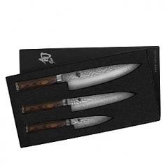 VG10 steel core with Damascus pattern stainless-steel Oblong walnut pakkawood handle for comfort Ideal starter set for newlyweds chefs or as an upgrade Hand-wash for best performance Includes 4-inch 6.5-inch and 8-inch knives gift box. The ideal gift set for newlyweds new home owners and the budding chef or for upgrades in your own kitchen the Shun Premier 3 Piece Starter Set is sure to please any recipient. With VG10 steel core construction and 32 layers of stainless Damascus these knives each have a 16-degree convex ground edge for precise cutting power. Beveled for lateral stability and incredible precision the knives makes it easy for you to navigate your way through many chopping tasks in style. This set includes a 4-inch paring knife a 6.5-inch utility knife and an 8-inch chefs knife. The striking hammered finish called tsuchime in Japanese acts similarly to a series of hollow-ground cavities reducing drag and quickly releasing foods from the blade so you can quickly move from one task to another. The walnut pakkawood handle nestles comfortably in your hand balanced with the beautiful Shun logo embossed on the bottom end. Whatever the occasion you are sure to love giving (or receiving) these carefully crafted knives because of their exquisite style and the precision with which they cut. Set includes: 4-inch paring knife 6.5-inch utility knife 8-inch chefs knife About KAI USA Ltd. For more than 100 years the highly skilled artisans of KAI USA Ltd. home of Kershaw knives and Shun cutlery have been producing blades of unparalleled quality in the spirit of the legendary swords smiths of Japan. For more than three generations they have been dedicated to listening to the voices of customers and providing products that contribute to a more tasteful life. Incredibly sharp edges partnered with a stunning aesthetic set Shun and Kershaw knives apart from others. A tradition of excellence combined with the newest technology and advanced materials makes every knife a functional work of art.