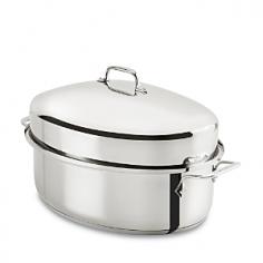 Heavyweight All-Clad Oval Roasting Pan with large domed lid is ideal for roasting and braising a turkey, ham or large cuts of meat. Durable construction: 18/10 stainless steel with aluminum core and impact-bonded, induction-ready base. The premium aluminum core speeds even heating throughout the entire stainless steel roasting pan. Improving the nonstick performance of the turkey roaster, the interior's starburst finish will not react with foods and is ideal for braising meats on the cooktop before oven roasting. Brushed magnetic base with convenient rolled pouring lip is perfect for induction cooktops. Stainless steel rack allows heat to cook all around meat and rack's easy-grip handles assist with lifting foods from the All-Clad oval roasting pan. Domed lid helps circulate steam and flavors and seals in moisture and nutrients. Heavy-duty bottom is perfect for deglazing on the stove top after roasting. With comfort-grip riveted handles, the stainless steel roasting pan smoothly transfers to table. Safe for use on any stove top, in the oven to 500 F and under the broiler. All-Clad crafts premium-quality kitchen cookware at its base in Pennsylvania with aluminum and stainless-steel bonded or "clad" together for exceptional even heat distribution and retention. Meticulous hand-finishing and durable construction continue to make All-Clad a preferred choice many of the world's professional and home chefs. Product Features 18/10 stainless steel construction with aluminum core for fast, even heating Impact-bonded, induction-ready base is ideal for braising meats on cooktop after roasting Interior's starburst finish boosts nonstick performance Stainless steel cookware interior will not react with foods Stainless steel rack allows heat to cook all around meat Rack's easy-grip handles assist with lifting foods from pan Domed lid helps circulate steam and flavor and traps in moisture and nutrients & b