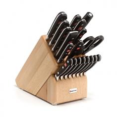 Cutlery Sets - This comprehensive 20-piece block set of Wusthof Classic knives includes every essential cutlery tool. The Wusthof Classic line of German knives features precision-forged blades of high-carbon stainless-steel that sharpen easily and hold an edge. This knife set includes the tools for every kitchen task, with paring and utility knives, hollow-edge santoku, chef's knife, and more, these Wusthof knives are the essential tools for quick efficient prep. Ideal for the buffet table, this cutlery set includes bread knife, hollow-edge carver, meat fork, cleaver and sharpening steel for efficient tableside service. The come-apart kitchen shears feature bevel- and serrated-edge blades of high-carbon stainless-steel to cut apart chicken, snip herbs and cut parchment paper. Using the adjustable gripper teeth below the handles, this tool also opens jar lids and bottle caps. The handles on these shears pull apart to clean or sharpen blades. 25-slot hardwood block. Lifetime manufacturer warranty on cu - Specifications Model 8620 Block: 12 1/2"L x 6 1/4"W x 9 1/2"H Weight: 14-lb. (w/tools) Cutlery made in Solingen, Germany Lifetime manufacturer warranty on cutlery Care and Use Wusthof knives are dishwasher-safe but hand washing is recommended. In the dishwasher, your Wusthof knives may bang against other cutlery or pots and pans and nick the blades. Wipe the knives clean with a wet cloth and dishwashing detergent. Dry immediately. Dry from the back of each knife to the blade. No metal is completely stain-free. To prevent slight tarnishing, be sure to remove acidic foods (lemon, mustard, ketchup, etc.) from the blades after use. If blades should show some signs of staining, clean with a non-abrasive metal polish. To prevent irreparable blade damage, it is best to store your knives in a knife block or in-drawer tray.