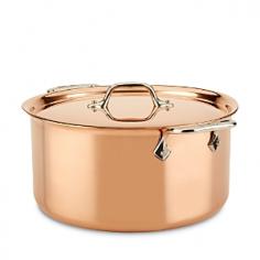 Soup & Stock Pots - The reliable pot for cooking soups and stocks and canning preserves, the 8-qt. All-Clad c2 Copper Clad Stockpot outperforms traditional copper cookware in heat conductivity and distribution. Compared to the leading copper cookware, the Copper Clad soup pot ranks 36%* higher in thermal conductivity and 25%* higher in even heating without hot spots. Engineered of 99.9% pure copper bonded to premium stainless-steel, the 8-qt. stockpot with lid's high sides and wide bottom gives ample space to saute ingredients before adding liquids to create soups or starting a roux for stews or etouffee. With its increased copper thickness, the All-Clad c2 Copper Clad stockpot rapidly heats to boil shellfish and pasta or simmer apple cider and marina sauce for the whole party. The ultra-durable, flat stainless-steel cooking surface will not react with foods so tastes stay pure. The 8-qt. stockpot with lid includes flared rim for mess-free pouring and contoured stainless-steel handles for ergonomic comfor - Specifications Made in the USA Material: copper, polished 18/10 stainless-steel Model: 8701005268 Capacity: 8 qt. Size: 11 1/2" Dia. (14 1/4"L with handles) x 5 1/2"H (6 1/2" with handle) Base: 9" Dia. Weight: 7 lb, 7 oz. Use and Care Before using the All-Clad c2 Copper Clad pan for first time, wash in hot, soapy water with a sponge or dishcloth. Rinse in hot water and dry thoroughly. Hand wash with warm soapy water after every use. To prevent water spotting, after washing, rinse in hot water and dry immediately. Do not use bleach or harsh chemicals on the copper cookware. Use only nylon scrubbing pads. Copper can change color through use, over time. To restore your copper cookware to its luster, occasionally clean the cookware with a copper cleaner, such as: EZ-Brite Penny Brite Copper Cleaner, item 30890. Rub cleaner in a circular motion over cookware and rinse in lukewarm water.