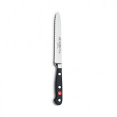 Every element of this renowned cutlery contributes to its precision and ease of use. The high-carbon stainless steel blades are hardened to maintain a sharp edge and full tangs provide perfect balance with riveted, high-impact composition handles. Designed much like a tomato knife, this serrated knife will cut into food with crusty or hard outsides and soft insides while leaving everything intact. Great for snack food like cheese, salami, bagels and tomatoes. Keep on handy on picnics, and wine and cheese trips. Prized possessions of professional chefs, Wusthof knives are an invaluable asset of any kitchen. In Solingen, Germany, each piece is hand-forged in 38 manufacturing steps by skilled craftsmen. Lifetime warranty. Wusthof's newest state of the art technology incorporates a new computer controlled method for putting the edge on Classic knives. This technology allows for an exacting edge from the tip of the knife down to the heel of the knife. With this newer precision, the knives are made sharper to 14 degrees per side for a total of 28 degrees. The knives are now sharper and this refinement increases the sharpness retention because exacting angles and edges last longer than edges sharpened by hand. The result is a knife that is 30 sharper and the ICP (Initial Cutting Performance) lasts twice as long.