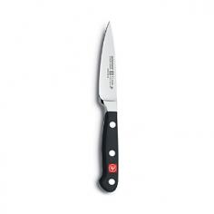 Great for making fruit garnish for drinks or for peeling citrus. ; Forged from one piece of specially tempered high carbon stainless steel for exceptional strength. ; The special steel alloy that comprises the blade assures that it is exceptionally sharp and has a long-lasting, easily restorable edge. ; The bolster provides heft and balance as well as a finger guard for safety and comfort. ; Full tang construction from the bolster through the back of the handle for a solid feel and confident control. ; Riveted synthetic handle is smooth and seamless for a comfortable grip. ; Attention to details include a ground and polished spine with an etching of the steel formula and trident logo. ; Carefully hand wash and towel dry. ; Blade length: 3.5 Blade width: 0.75 Handle length: 4.0 Weight: 2.1 oz. ; Made in Germany.