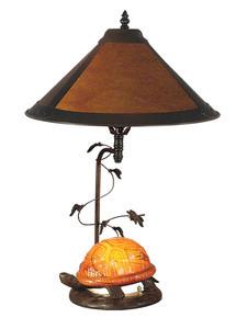 Metal base in antique bronze paint Table lamp in Tiffany style Empire shaped lamp in mica shade Requires (1) 60-watt E27 and (1) 15-watt E12 bulbs (not included) Dimensions: 14.75L x 14.75W x 22.75H inches An orange-shelled turtle pauses under the amber mica shade on the Dale Tiffany Mica Amber Orange Turtle Table Lamp, creating a blend of fun and elegance for this beautiful light. This table lamp has a metal base in antique bronze, and uses one 60-watt bulb for the main fixture and one 15-watt bulb for the turtle's shell (bulbs not included). About Dale Tiffany Founded in 1979, Dale Tiffany, Inc. started manufacturing Tiffany-styled lamps and shades, emphasizing high-quality reproductions of Louis Comfort Tiffany's famous designs. Today, using only the highest quality genuine hand-rolled art glass, Dale Tiffany offers an extensive range of designs to comprise the world's foremost collection of fine art glass lighting and home accents. With this hand-crafted process, no two pieces are exactly alike, making each design a treasured keepsake. Dale Tiffany captures the timelessness of America's classic designers while developing unique designs that blend perfectly with today's home fashion trends and lifestyles.