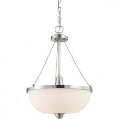 Nuvo Lighting 60/4187 Helium Three Light Pendant with Satin White Glass, in Brushed Nickel Finish This collection's lighter than air appearance creates the illusion that Helium's glass shades are floating above the fixture's frame. Strong, yet open and airy, Helium is the right match for many contemporary home designs. This collection is offered in Vintage Bronze with Cream Beige glass shades and Brushed Nickel with Satin White glass shades. Nuvo Lighting 60/4187 Features: Finished in Brushed Nickel Requires (3) 60 Watt Medium Base Incandescent Bulbs (Not Included) Satin White Glass Shade Includes 48" of Chain, and 12' of Wire Additional Chain Available - Part #25-1069 Light Direction: Up / Down - Light from this fixture illuminates both upward and downward Nuvo Lighting 60/4187 Specifications: Product Dimensions: 24"H x 17"W UL Listed for Dry Locations 120 Volts 180 Total Watts 1.5 Amps Nuvo Lighting's Commitment to Quality: Threaded Sockets- All fixtures with fitted glass shades feature threaded ceramic sockets with fitters. Thumb screws are never used, which allows for a more refined look. Reinforcement- Vanity fixtures with arms on elongated backplates have steel reinforcement bars to prevent flexing Diffusers- All pendant fixtures with an open top are supplied with a glass diffuser, which helps alleviate 'hot spotting' and evenly distributes light Chain and Wire- Hanging fixtures are provided with 12 feet of wire and 4 feet of chain. Oversized chandeliers include 6 feet of chain CUL Damp Location Listing- All flush mount dome fixtures are CUL Damp location listed, which allows more flexibility in installation. Founded in 1966, Satco is a well-known premier supplier of lighting products. With the company's keen understanding of the lighting industry, and after three years of development, Satco launched Nuvo Lighting on June 23, 2005. Nuvo Lighting is uniquely poised to become an industry leader, with the sales and distribution resources of Satco Products, combined with the finely-conceived and well-crafted products that deliver style, value and quality.